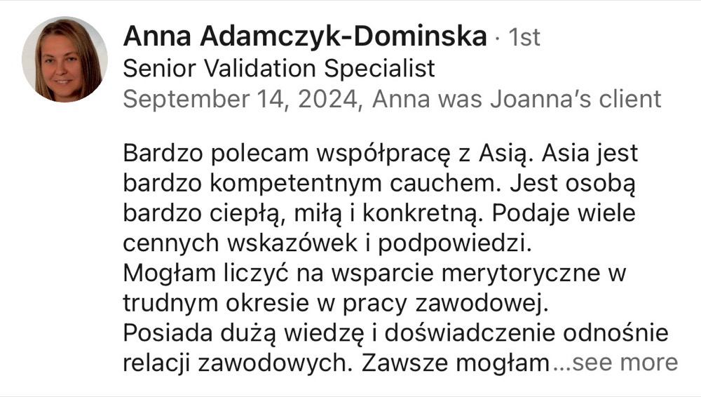Po niemal roku szukania pracy, frustracji i poczucia bezsilności postanowiłam, że nie pozwolę, by sytuacja kontrolowała moje życie. Zaczęłam aktywnie uczyć się nowych umiejętności i inwestować w swój rozwój. Z każdą nową decyzją i krokiem do przodu odkrywałam w sobie siłę, której wcześniej nie dostrzegałam. W ciągu kolejnych lat nie tylko spłaciłam swoje długi, ale też zbudowałam stabilny biznes coachingowy i mentoringowy, współpracując z ekspertami z Belgii, Anglii, Holandii, Danii i oczywiście Niemiec.