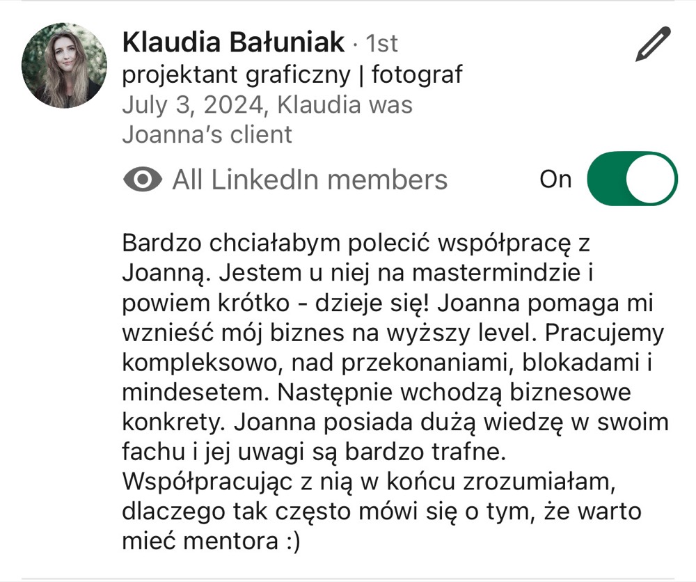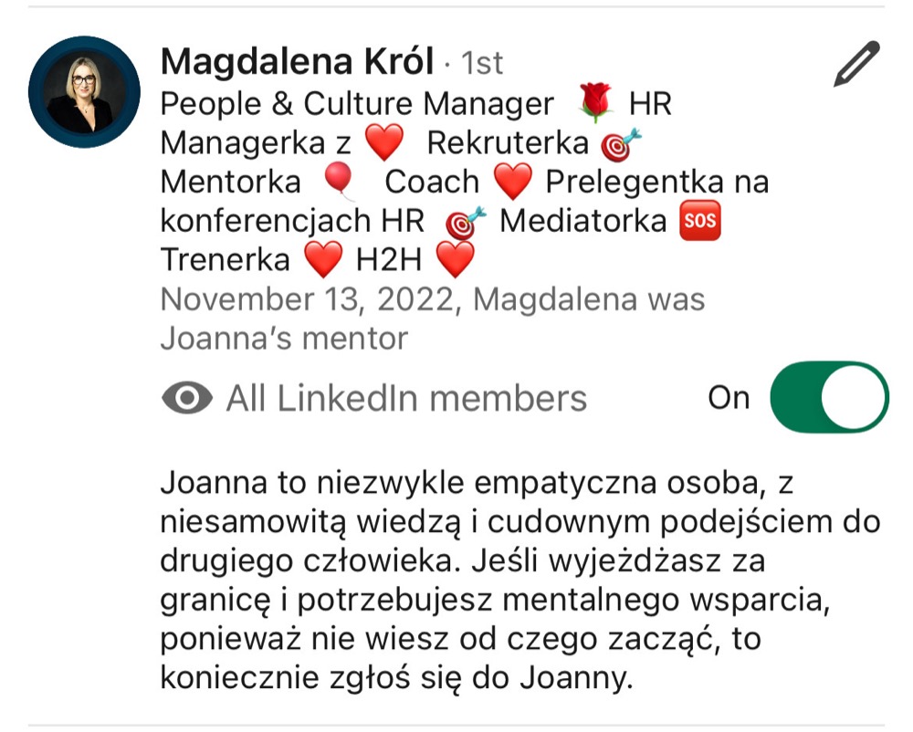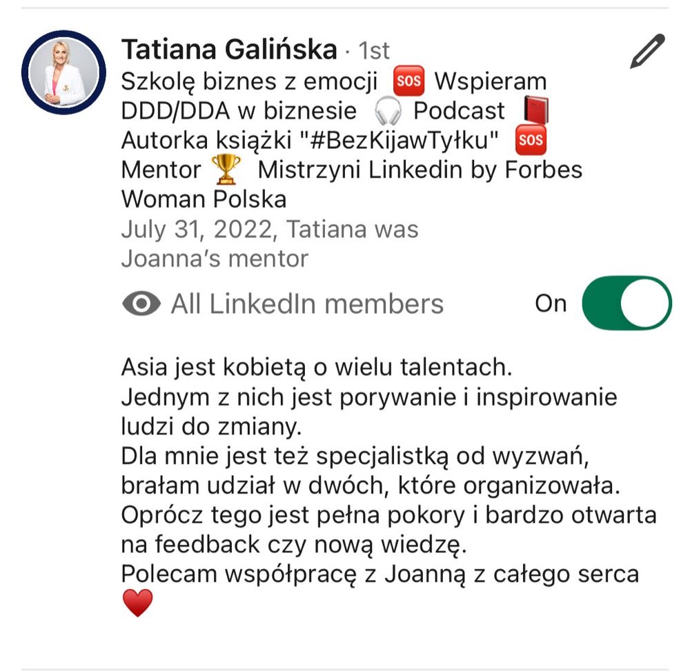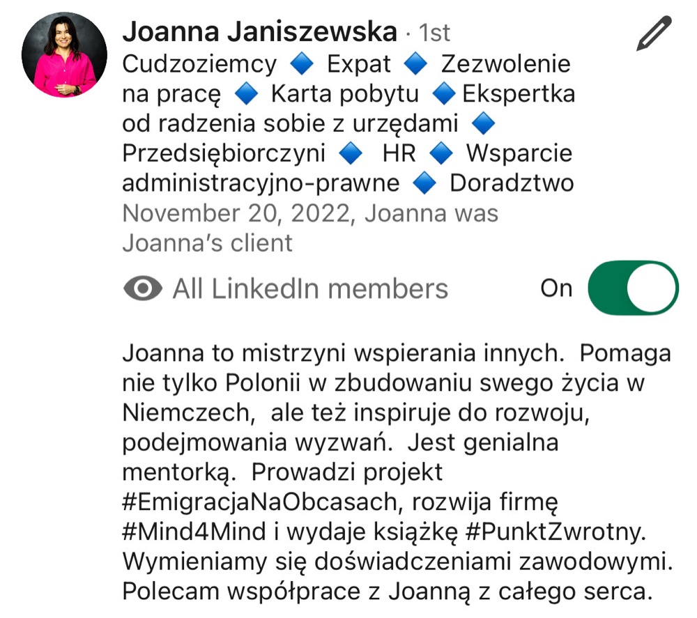 Dziś pomagam innym Polakom przejść drogę, którą sama przeszłam – ale szybciej, prościej i bez popełniania kosztownych błędów. Dzięki autorskiej metodzie „OTWIERACZE osobistej mocy” setki moich klientów skutecznie odnalazło swoje miejsce na niemieckim rynku pracy i w biznesie. Nie jest to teoria z książek, lecz efektywnie działający zestaw narzędzi mentalnych i praktycznych strategii, które wypracowałam przez ostatnie lata. Prowadziłam dziesiątki warsztatów, wyzwań i kursów online, pomagając ludziom odważnie wychodzić przed kamerę, rozwijać marki osobiste na LinkedIn, a nawet trafiać na ekrany telewizji.